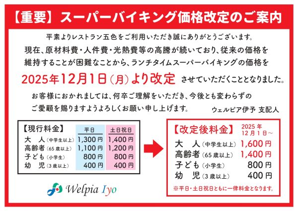 ランチタイム「スーパーバイキング」価格改定のご案内(2025年12月~)