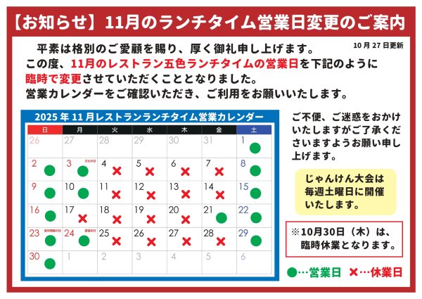 レストラン五色ランチタイム臨時休業および11月の営業日変更のご案内(10/27更新)