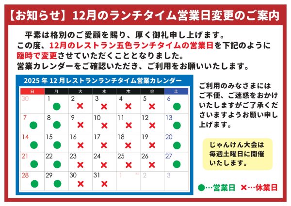 レストラン五色ランチタイム2025年12月の営業日変更のご案内